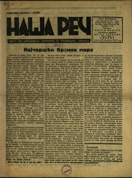 НАША реч : лист за друштвена, културна и привредна питања / власник Милош Мацура ; одговорни уредник Дејан Алексић. - Год. 1, бр. 1-8 (21. феб.-11. дец. 1939). - Скопље : Милош Мацура, 1939 (Скопље : Штампарија "Јужна Србија"). - 32 cm Двонедељно. - Штампарија од бр. 3 (1939) Братство, Скопље. - Орган Покрајинског комитета Комунистичке партије Југославије за Македонију, од бр. 5 (1939) забрањен. - Наставља се као: Наш глас 329.15 COBISS.SR-ID 32430092 |