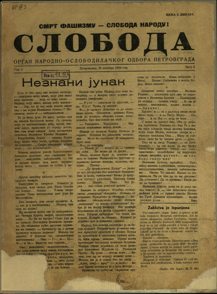 СЛОБОДА : орган народно-ослободилачког одбора Петровграда. - Год. 1, бр. 1-13(1944). - Петровград [тј. Зрењанин] : [Народноослободилачки одбор], 1944. - 31 cm Двапут недељно. - Био је први лист у ослобођеној Војводини. - Изашло је свега 13 бројева 32 COBISS.SR-ID 125616903 |