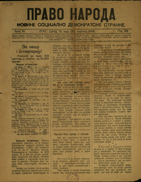 ПРАВО народа : новине Социјално демократске странке / власник, накладник и одговорни уредник Витомир Кораћ. - Год. 1, бр. 1 (22. фебруар 1907)-год. 6, бр. 14 (23. март 1912); год. 8, бр. 1-30 (21. фебруар-11. јул 1914) ; год. 1, бр. 1/2 (15. јул 1920)-год. 16, бр. 1 (2. јануар 1929). - Загреб ; Шид ; Београд : Витомир Кораћ, 1907-1914;1920-1929 (Загреб : Штампарија Мике Маравића). - 39 cm Два пута месечно (1. и 3. четвртка у месецу). - Поднаслов: од бр. 7-22 (1910) Новине социјално демократске странке и орган Српског социјално демократског агитацијског одбора у Угарској; од бр. 23 (1910) новине Социјално демократске странке; од бр. 1/2 (1920) новине Социјално демократске странке Југославије; од бр. 6 (1923) новине Социјалистичке Партије Југославије; од бр. 1 (1929) Орган Социјално Демократскога Акционог Одбора. - Одговорни уредници: од бр. 1/2 (1920) Драгутин Симоновић; од бр. 6 (1923) Драгутин Бекер; од бр. 1 (1924) Глигорије Нинковић; од бр. 1 (1927) Вјекослав Братковић. - Место издавања: од бр. 33 (1908) Шид; од бр. 1/2 (1920) Београд; од бр. 6 (1923) Шид; од бр. 1 (1927) Београд - Земун. - Власници: од бр. 33 (1908) власник, накладник и штампа Књижарско-штампарска задруга "Право народа"; од бр. 10 (1914) власник и накладник Књижарско-штампарска задруга "Право народа" Шид; од бр. 1/2 (1920) власник Власник Витомир Кораћ; од бр. 6 (1923) власник Драгутин Бекер; од бр. 1 (1924) власник и накладник Књиж.-штамп. задруга "Право народа"; од бр. 1 (1927) власник и издавач Вјекослав Братковић. - Штампарије: од бр. 33 (1908) Штампарија "Право народа", Шид; од бр. 1/2 (1920) Штампарија "Будућност", Београд; од бр. 1 (1924) Књиж. штамп. задруге "Право Народа"; од бр. 1 (1927) штампарија "Привредни Преглед"; од бр. 21 (1927) штампарија Драг. Грегорића; од бр. 28 (1928) штампарија "Дом". - Формати: од бр. 9 (1908) 31 cm; од бр. 1/2 (1920) 33 cm. - Излази: од бр. 10 (1907) 2. и 4. четвртка у месецу; од бр. 1 (1909) сваког уторка; од бр. 19 (1909) сваког четвртка; од бр. 46 (1910) сваке среде; од бр. 4 (1910) сваког петка; од бр. 6 (1923) сваког четвртка; од бр. 1 1927) 1. и 15. у месецу. - Ћир.; од бр. 1/2 (1920) ћир. и лат.; од бр. 6 (1923) непарни бројеви ћир., парни лат.; од бр. 1 (1927) ћир. - Лист Социјалистичке партије Југославије излазио је с прекидима. Од 6. априла 1912. до 6. марта 1914. није излазио. Обустављен је јула 1914. због рата. Обновљен јула 1920. са првим годиштем, касније (1923) узима старо годиште. 1925. године лист је привремено престао да излази, а после обуставе листа "Слобода" из Шида, "Право народа" је поново почело да излази али у Београду и повремено у Земуну. Штампа ћир. и лат. - У бр. 7 (1910): Закључком V конгреса Срба социјалиста у Угарској, коначно је спојен "Народни глас" и "Право Народа" у јединствени лист, тако да је од сада "Право Народа" орган и Српског Агитационог Одбора Социјално-демократске странке у Угарској. - Годиште (1912) илустровано. - Социјалистички лист. - За Аустро-Угарску и БиХ годишње 2 к 80 филира, за остале државе 3 к 60 филира, број 10 филира; од бр. 9 (1908) за Аустроугарску и БиХ 4 к годишње, за остале државе 5 к 60 фил., број 8 филира; од бр.12(1908) број 6 филира; од бр. 19 (1909) годишње 4 к, за остале земље 5 к 60 фил., број 8 филира; од бр. 46/47 (1909) за Северну Америку годишње 1 долар и 20 центи; од бр. 1 (1910) годишње 4 к 80 ф.; од бр. 1 (1912) 6 к. годишње, поједини бројеви с прилогом 12 филира, без прилога 8 ф; за стране земље годишње 10 к; од бр. 10 (1914) годишње 6 к, за стране земље 8 к; од бр. 1/2 (1920) број 50 пара (2 кр.); од бр. 6 (1923) годишње 40 дин., број 1 дин.; од 1924. годишње 48 дин., за иностранство двоструко; од бр. 10 (1925) број 1,50 дин.; од бр. 1 (1927) годишње 40 дин., за иностранство 10 дин. ви