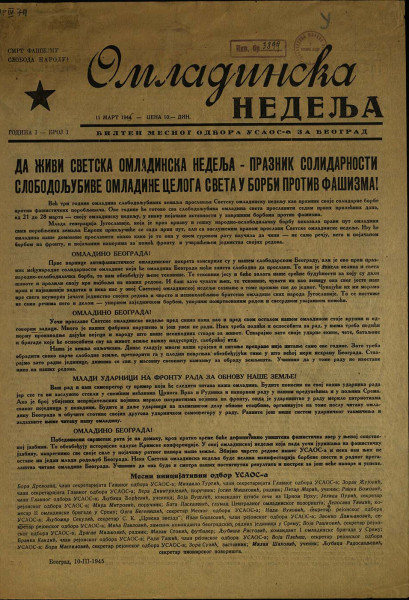 ОМЛАДИНСКА недеља : билтен Месног одбора УСАОС-а за Београд. - Год. 1, бр. 1-6 (1945). - Београд : УСАОС, 1945. - 24 cm