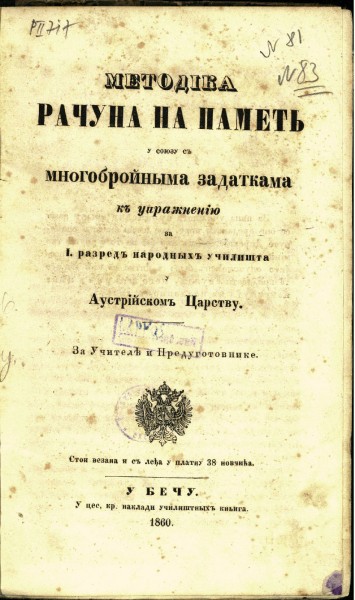 АТАНАЦКОВИЋ, Платон Кириловић 1988; КНБС 76. - Аутор дат према КНБС; Српске штампане књиге БМС 1801-1867, 121. - "Стои везана и сЪ леђа у платну 38 новчића." --> насл. стр. |
