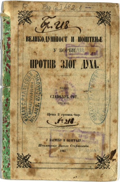 РОТ, Славољуб Новаковић 3186; КНБС 2397; Српске штампане књиге БМС 1801-1867, 4124. - "Цена 2 гроша чар." --> насл. стр. |