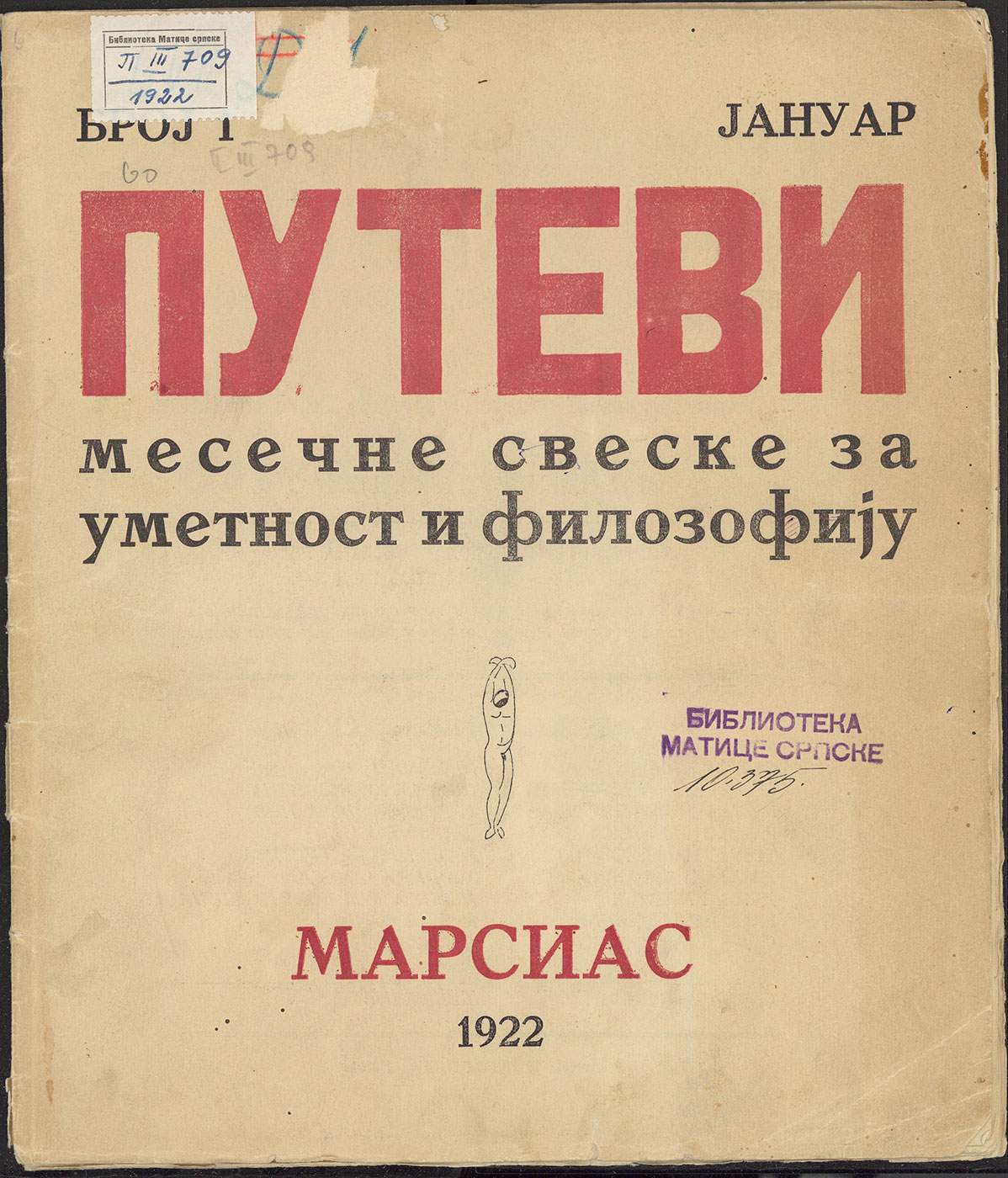 ПУТЕВИ : месечне свеске за књижевност, уметност и филозофију / уредници Милан Дединац, Душан Тимотијевић, Марко Ристић. - 1922, св. 1-2 (јан.-феб.); н. с. 1923, св. 1 (окт.)-1924, св. 3/5 (јун/авг.). - Београд : Марсиас, 1922; 1923-1924 (Београд : Акционарска штампарија). - 29 cm |