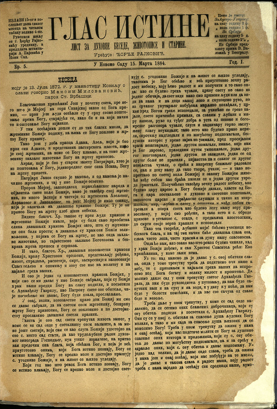 ГЛАС истине : лист за духовне беседе, животописе и старине / власник и издавач А[рса] Пајевић ; уређује Ђорђе Рајковић. - Год. 1, бр. 1 (15. јан. 1884)-год. 7, бр. 24 (31. дец. 1890). - У Новоме Саду : А[рса] Пајевић, 1884-1890 (Нови Сад : Штампарија Арсе Пајевића). - 36 cm. - 26 cm |