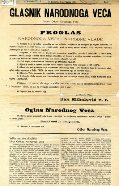 Гласник Народнога већа / одговорни уредник Људевит Ауер. - Год. 1, бр. 1 (4. новембар 1918)-год. 2, бр. 22 (6. јануар 1919). - Сремски Карловци : Одбор Народнога већа, 1918-1919 (Сремски Карловци : Српска манастирска штампарија). - 47 cm |