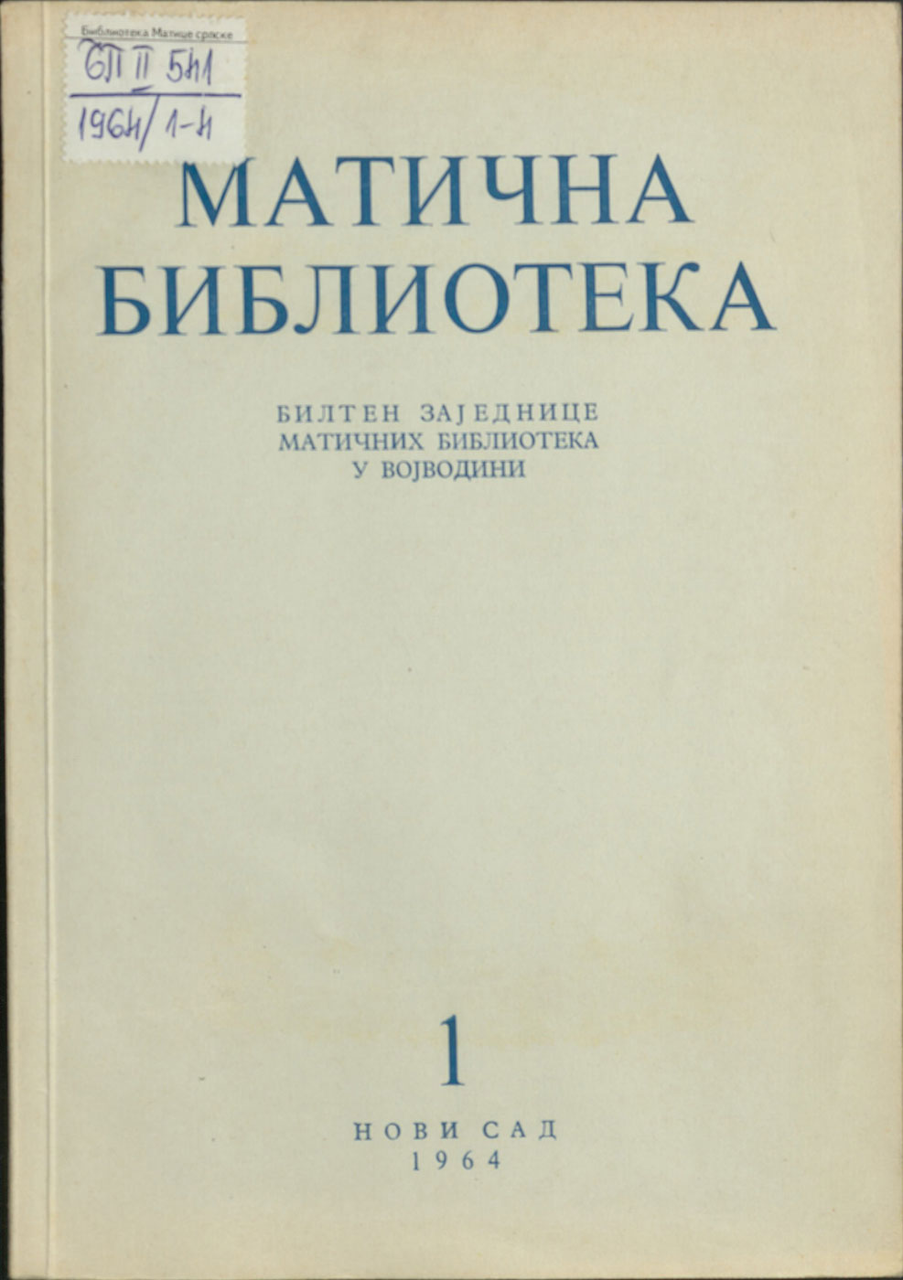 МАТИЧНА библиотека : билтен Заједнице матичних библиотека у Војводини / одговорни уредник Павле Малетин. - Год. 1, бр. 1 (1964)-год. 5, бр. 15/16 (1968). - Нови Сад : Матица српска, 1964-1968 (Нови Сад : Будућност). - 24 cm