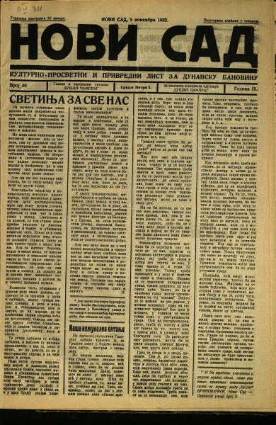 НОВИ Сад : потпуно незвисан орган јавног мишљења / одговорни уредник Велисав Спасић. - Год. 2, бр. 1 (1925)-год. 18, бр. 920 (1941). - Нови Сад : [б. и.], 1925-1941 (Нови Сад : Штампарија Душан Чампраг). - 34 cm COBISS.SR-ID 25283340 |