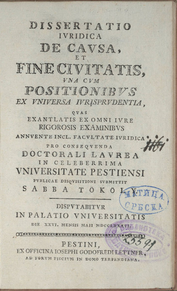 TEKELIJA, Sava Mihailović 191. - Nedostaje list sa portretom Petra Tekelije. - Broširano: БМСНС: Р18Лат II 4.1. - Karton obložen hartijom: БМСНС: Р18Лат II 4.2. - Nedostaje list sa portretom Petra Tekelije i str. 37-40, oštećenja hartije od nasl. list do str. 3. - Broširano: БМСНС: РТкЛат II 172. - Broširano.: РСТЛат II 80.1: БМСНС. - Karton obložen platnom, rez pozlaćen: РСТЛат II 80.2: БМСНС. - Stare sign.: 132, Дупликат 1161, Dpl 2644, II 301290: БМСНС: Р18Лат II 4.1. - Pečat: Библиотека А. Ивића Суботица; pečat: Матица србска: БМСНС: Р18Лат II 4.2. - Pečat: Књижница Текелијина завода. - Stare sign.: 4557, XIII, M 4262, II 300957, M II 4780: БМСНС: РТкЛат II 172. - Na prednjim koricama zapis S. Tekelije: Dissertatio juridica de causa et Fine civitatis Sabba Tököly Pestini 1786. -I-40.. - Stare sign.: 132, Дупликат 1161, LVII J 33, Дупл 63: БМСНС: РСТЛат II 80.1. - Na zadnjem kor. listu prilepljen list sa tekstom Save Tekelije na obe str. numerisano kao & 27 i & 28: Quidquid proinde hac potestate instructus fuerio, eam comformire, ad leges, quibus limites determinantur, exercere obstrietus est. Leges inquam, quod fundamentales dicimus, quodque .... - Stare sign.: 216 G 22, 1161: БМСНС: РСТЛат II 80.2