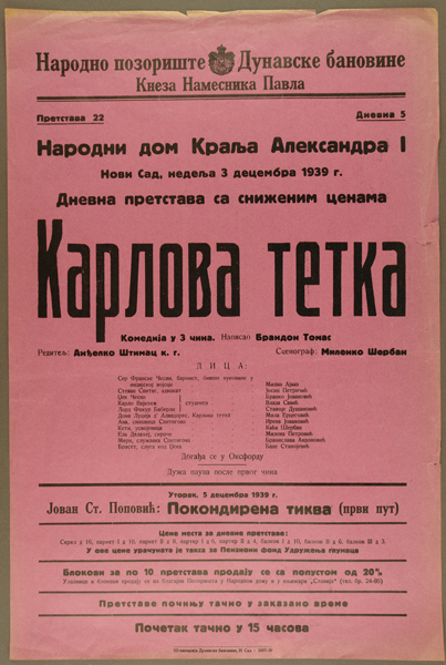 НАРОДНО позориште Дунавске бановине кнеза намесника Павла (Нови Сад) На плакату су подаци о ауторима представе : Написао Брандон Томас, редитељ Анђелко Штимац; сценограф Миленко Шербан ... [и др.] |