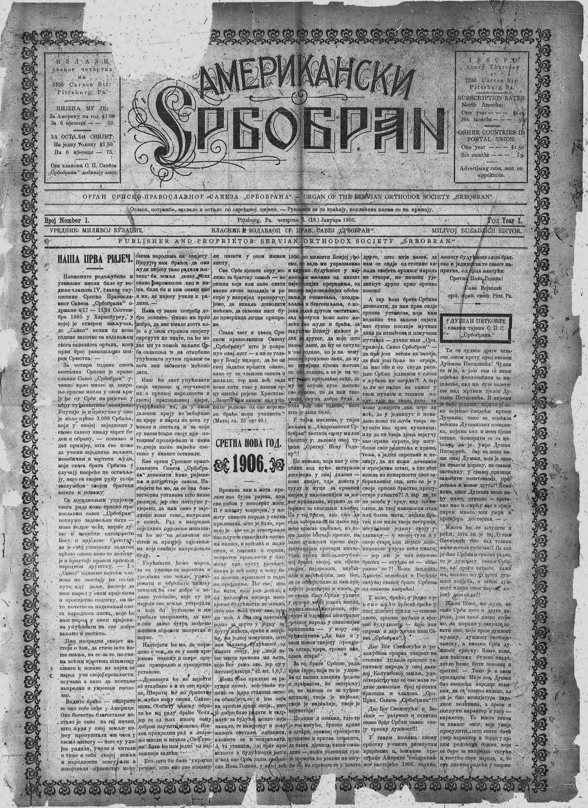 АМЕРИКАНСКИ Србобран : српски лист за политику, просвету и књижевност и орган Савеза Србобран = American Srbobran : official organ of S. Srbobran leading and largest Serbian daily in America / власник Српски православни савез Србобран ; уредник П. Ј. Будисављевић. - Год. 1, бр. 1 [1906]- . - Pittsburgh : [Serbian Alliance Srbobran], [1906]- (Питсбург : Американски Србобран). - Илустр. ; 58 cm |