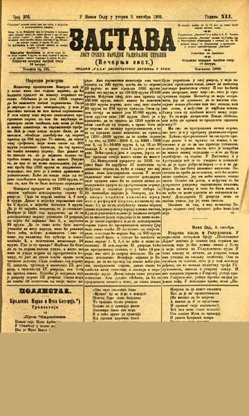 У периоду од септембра 1904. све до 1914. године публикација је имала два издања, Претраживање Заставе по тексту могуће је на сајту Претражива дигитална библиотека