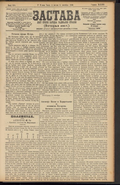 Год. 43, бр. 219 веч. (3. окт. 1908)