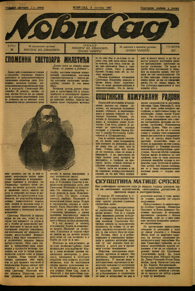 НОВИ Сад : потпуно незвисан орган јавног мишљења / одговорни уредник Велисав Спасић. - Год. 2, бр. 1 (1925)-год. 18, бр. 920 (1941). - Нови Сад : [б. и.], 1925-1941 (Нови Сад : Штампарија Душан Чампраг). - 34 cm COBISS.SR-ID 25283340 |